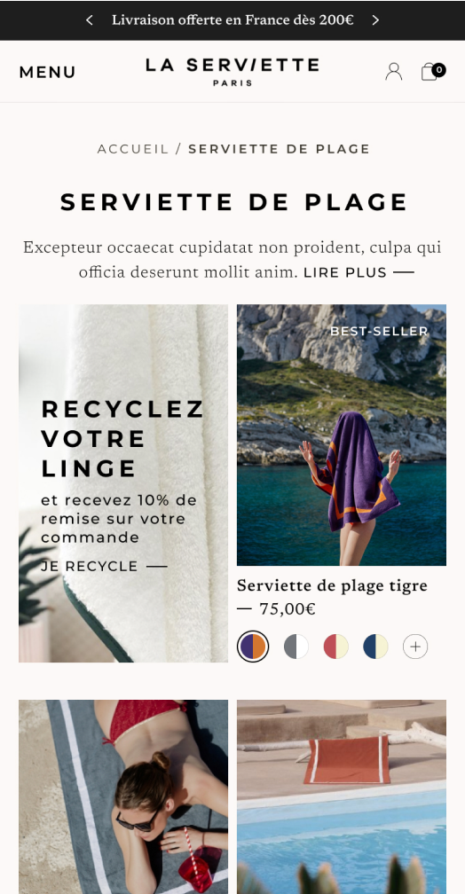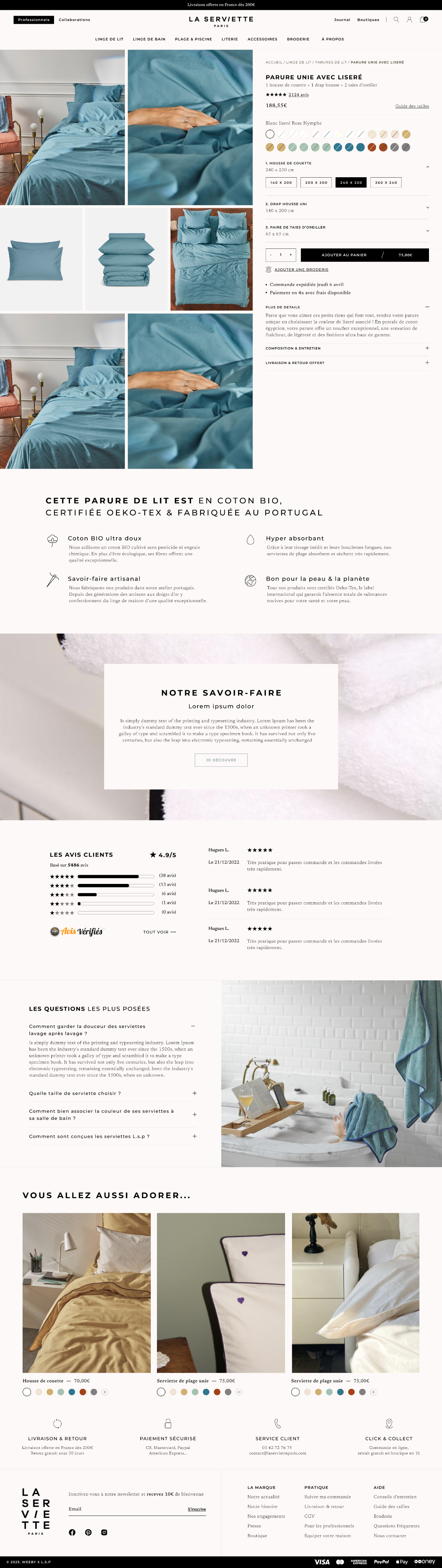 Refonte complète du site E-commerce de La Serviette Paris, marque française de linge de maison haut de gamme. Refonte de l’UX & UI afin d’offrir une expérience fluide, élégante et fidèle à l’univers raffiné de la marque.